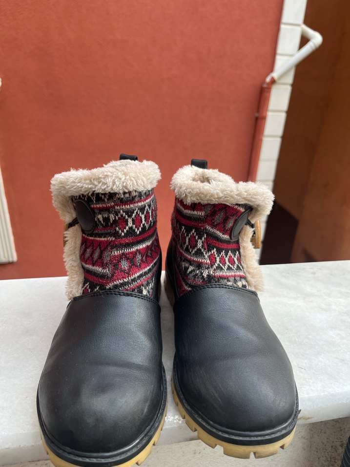 Kürklü detaylı, desenli ve yumuşak fleece malzemeden yapılmış kadın botları. Dolgu topuklu ve koyu kahverengi, bohem stile uygun, dış mekan kullanımı için sıcak tutar.