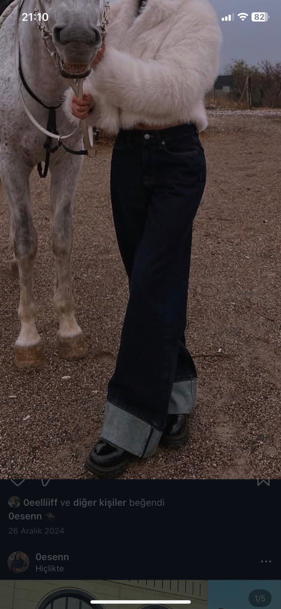 Kürklü detaylı, bol kesim midi boy koyu mavi kot pantolon. Günlük rahat sokak stili için uygundur.