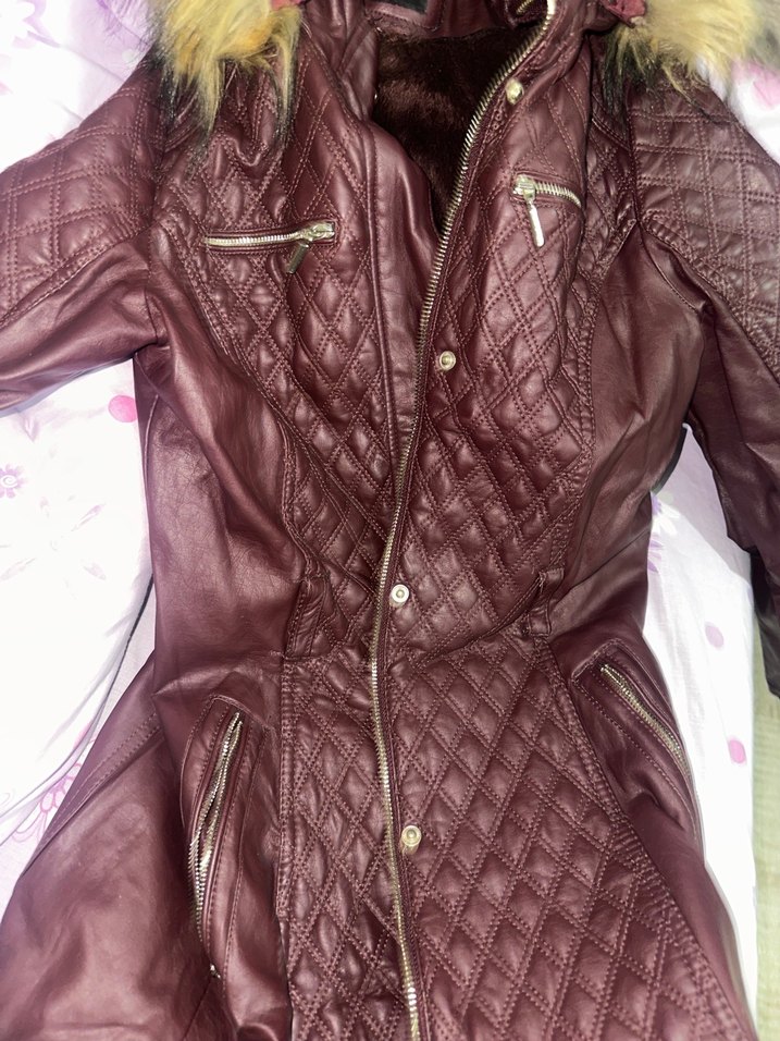 Kürklü detaylı, bordo renkli deri ceket, normal boyda ve dar kesim. Günlük kullanıma uygun parlak yüzeye sahip.