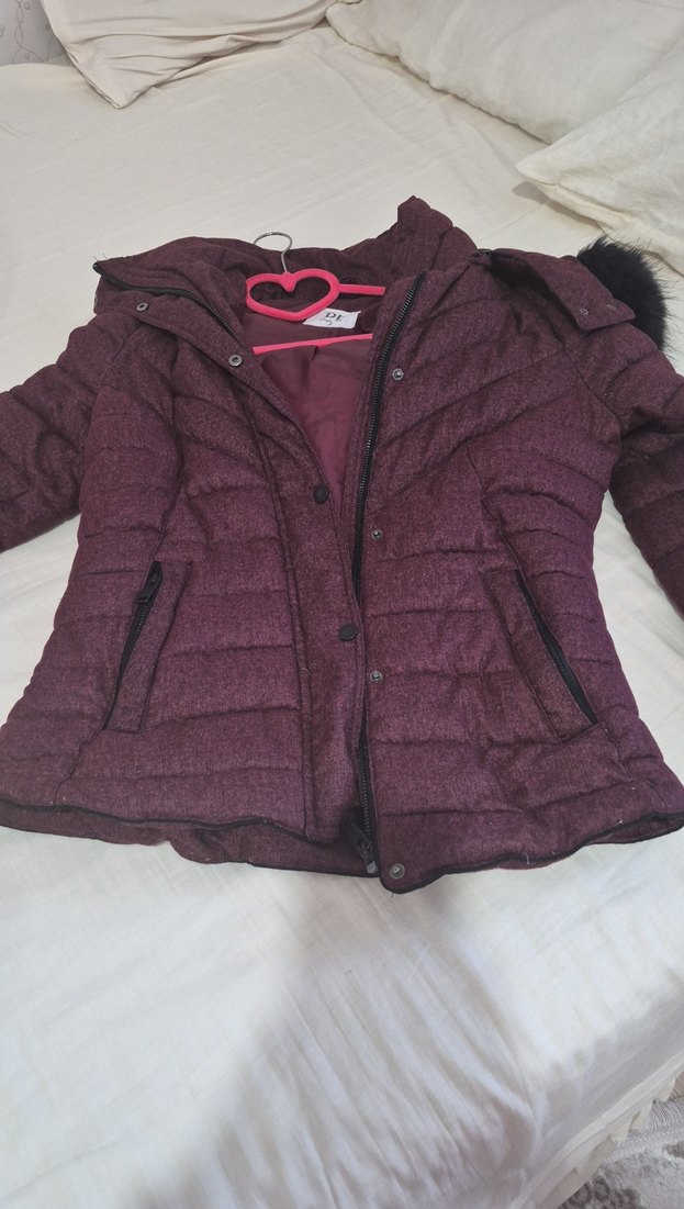 Bordo renkli, kürklü detaylı, yumuşak dokulu fleece kumaştan yapılmış, normal midi boyda, uzun kollu, kesimli kadın kışlık mont. ❄️