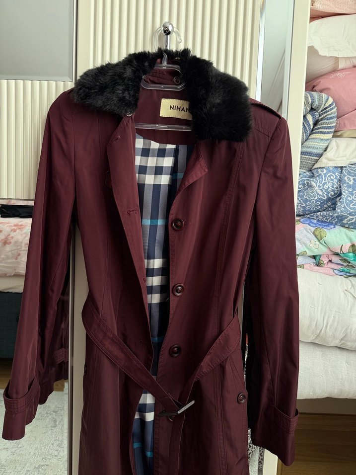 Bordo renkli kadın trençkot, kürklü yakası ve kesik yakasıyla dikkat çeker. Sentetik kumaştan, midi boy ve regular fit olup uzun kolludur. İş ve sokak stiline uygundur.