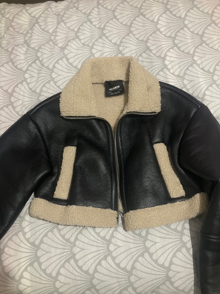 Deri ve yumuşak kürk detaylı, kısa kesim ve kesik yakalı, vücuda oturan kadın ceketi. Trend sokak stili için uygun.