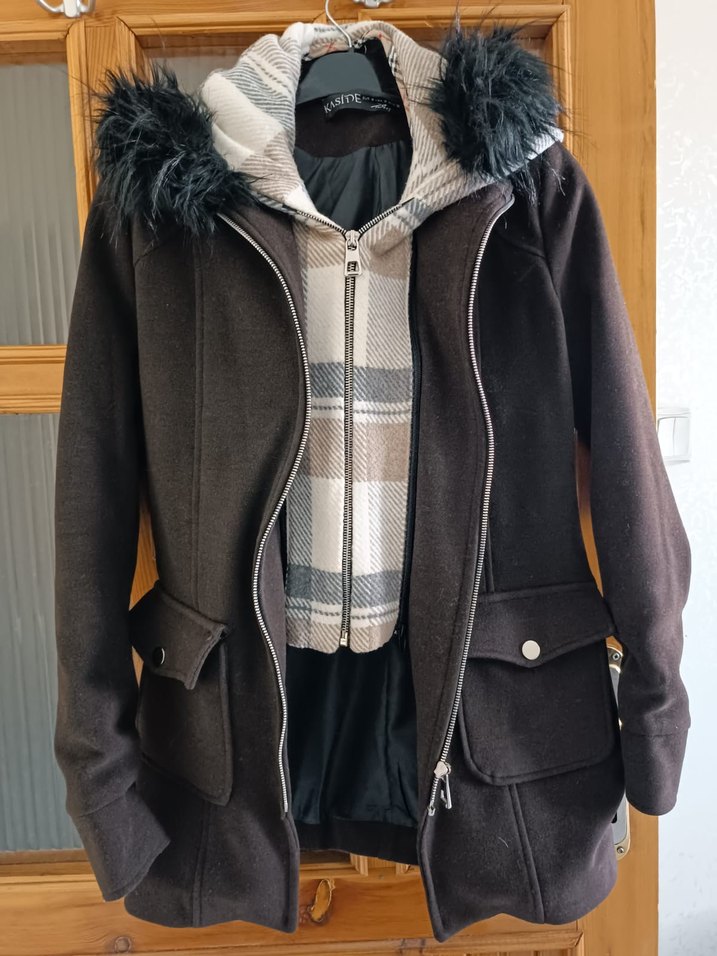 Kahverengi, kürklü detaylı, normal boy, uzun kollu, dar kesim kadın kışlık mont. Trendy sokak stili için uygundur.