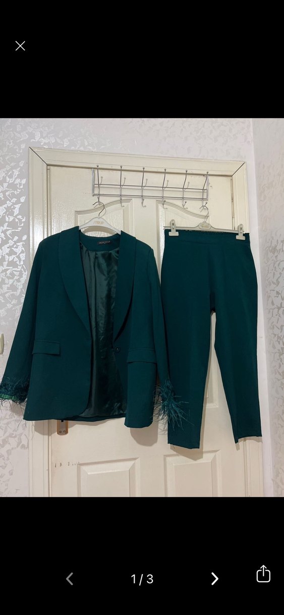 Koyu yeşil renkli, kısa kesim ve regular fit kadın blazer takımı. Sentetik kumaştan, uzun kollu ve kürk detaylı. İş ve sokak stiline uygun.