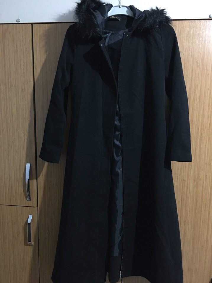 Kürklü detaylı kapüşonlu, siyah uzun kadın kaban. Uzun kollu, regular fit ve yumuşak, sıcak kumaştan üretilmiştir. Ofis için uygundur.