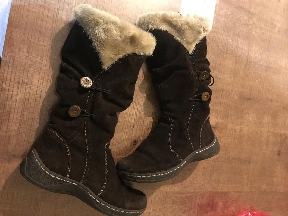 Kahverengi süet kadın botlar, dolgu topuk ve kürk detaylarına sahiptir. Rahat, bohem tarzıyla günlük kullanıma uygundur.