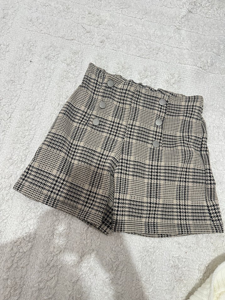 Bej ve gri ekose desenli, kürklü detaylı yüksek bel mini şort. Rahat kesimi ve yumuşak sentetik kumaşıyla günlük sokak stiline uygun.