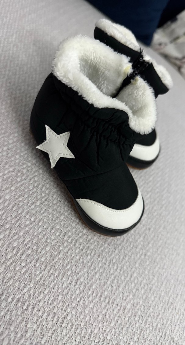 Erkek bebek botları, iç kısmı yumuşak kürklü ve sıcak tutan fleece kumaşlıdır. Sokak stili tasarımıyla siyah ve beyaz renklerde, yıldız detaylıdır. Trendy günlük kullanıma uygundur.