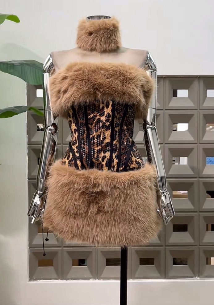 Leopar desenli, straplez mini elbise, kahverengi sentetik kumaş ve kürk detaylı, bust ve etek uçlarında, ayrıca boyunda kürklü choker ile tamamlanmıştır.