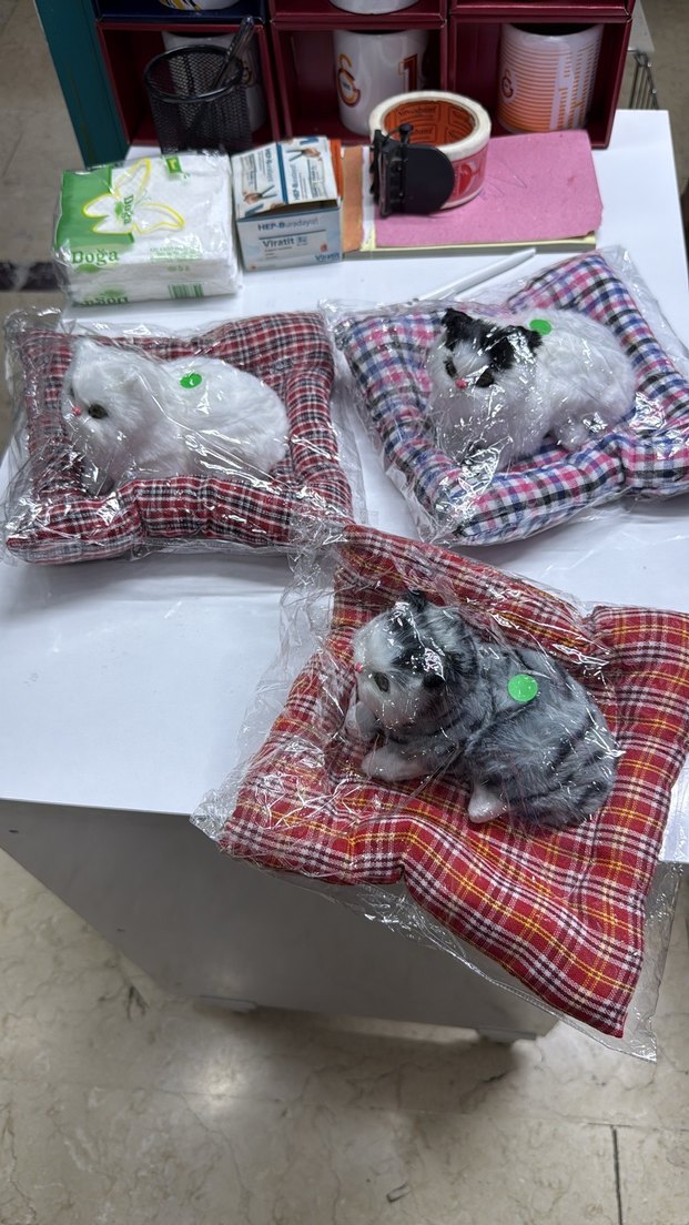 Gri renkte, batik desenli ve kürk detaylı kedi yatakları, rahat bir dinlenme alanı sunar.
