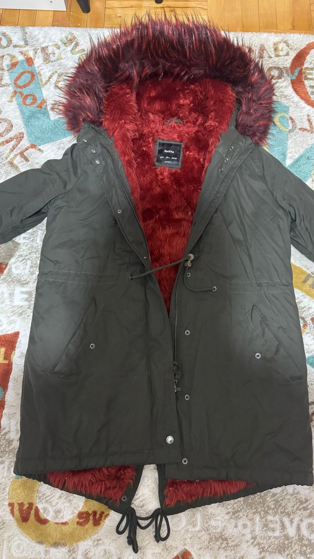 Haki renkli, kalçayı kapatan boyda, bol kesim kadın mont. Kapüşonunda ve iç kısmında kürk detayları bulunur. Uzun kollu, çıtçıtlı ve dış mekân kullanımı için uygundur.