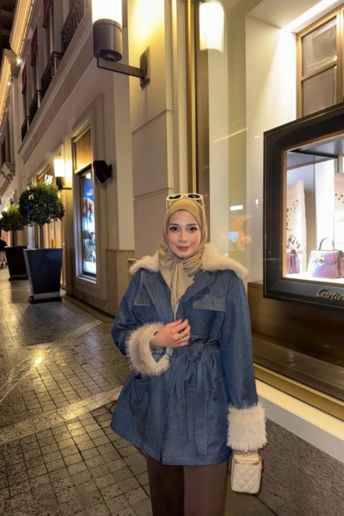 Camel renginde, etnik desenli ve kürklü detaylara sahip kadın denim ceketi. Uzun kollu, yüksek yakalı ve normal uzunlukta rahat bir kesime sahiptir.