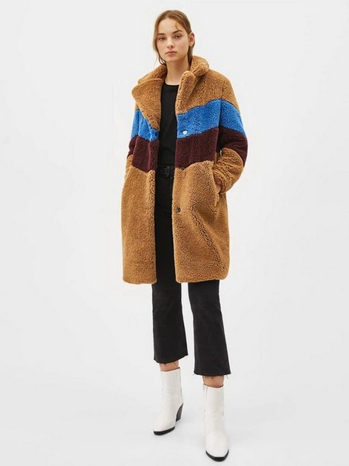 Kadın kaban, rahat kesim, uzun kollu ve çıtçıtlı yakaya sahiptir. Yumuşak kürk detaylı, kahverengi taban üzerinde mavi ve koyu kırmızı tie-dye desenlidir. Günlük sokak stili için uygundur.