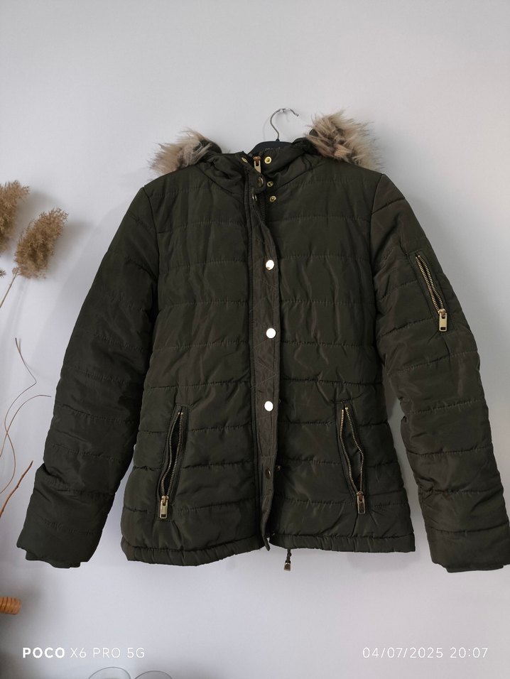 haki, kürklü detaylı, fitted kesim, normal boy, strappy kollu kadın kış montu. Yumuşak ve sıcak fleece kumaştan, dış mekan kullanımı için uygun. içi kürklü yeni gibi hiç bir sorunu yok m beden s bedenede uyumlu