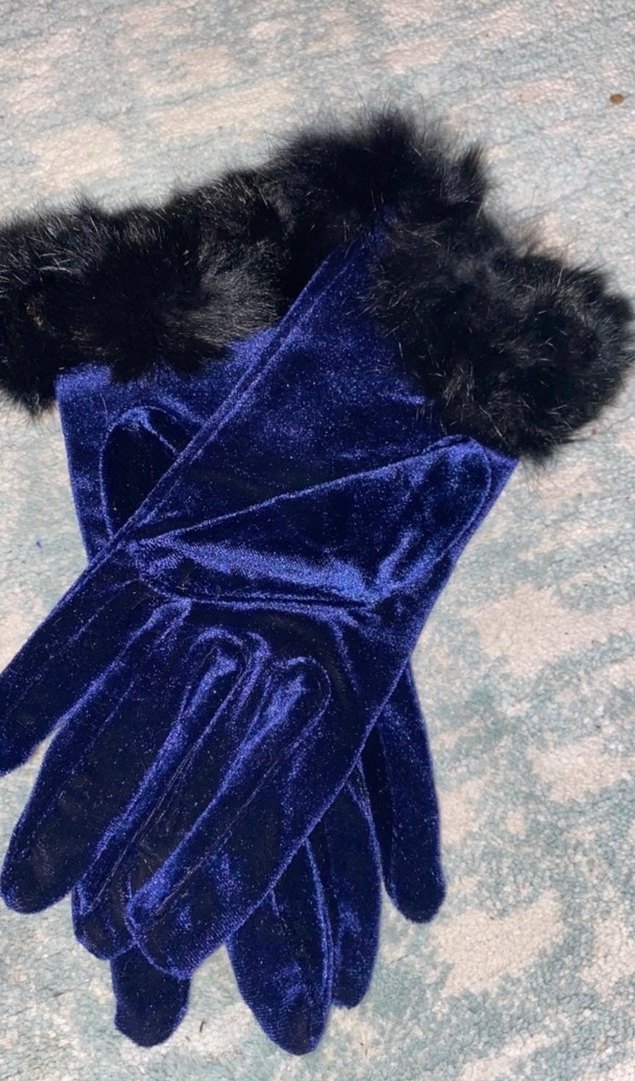 Kadınlar için koyu mavi kadife eldivenler, bilekte yumuşak kürk detayıyla rahat ve gotik tarzı bir araya getirir. Trend belirleyiciler için uygun.