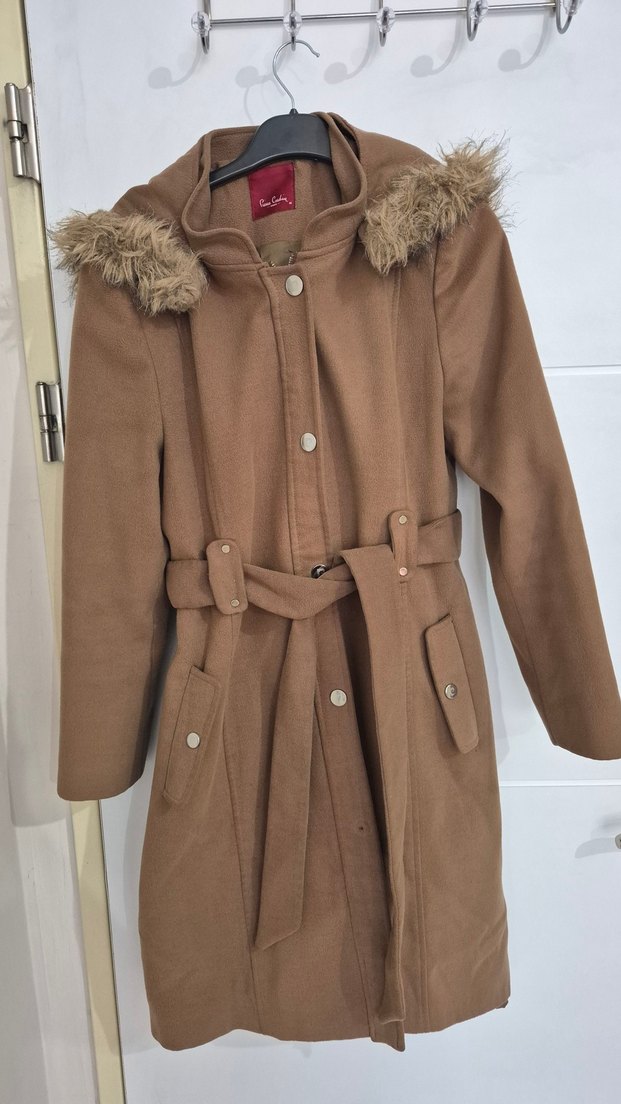 Kürklü kapüşonlu, bej renkli, belden kemerli, midi uzunlukta, ürün sağlam sadece arka kısımda siyah leke var ben çıkaramadım kurutemizlemeye de veremedim belki orada çıkarabilirlerdi. ön kısımda alt düğme düşmüş o yok sadece bu 2 kusuru var. çok şık sağlam kaliteli bir kaban.