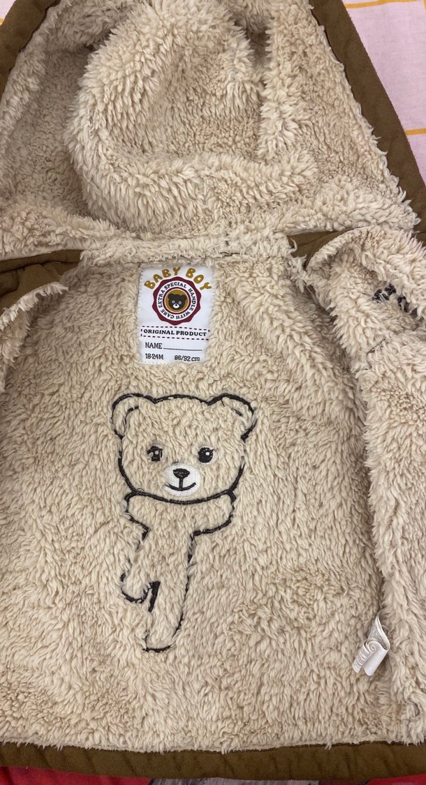 Kahverengi bebek tulumu, yumuşak ve sıcak kumaş, kürk detaylı ve işlemeli ayı deseniyle sokak stili için uygun. Şapka kısmında da kulakları mevcut çok sevimli duruyor.astronot şeklinde değil kısa mont.