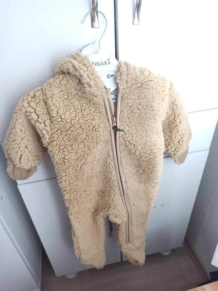 Kahverengi bebek tulumu, yumuşak ve sıcak kumaş ile kaplıdır. Kürklü kapüşon ve kolay giyilen ön fermuarı vardır. Desensiz, sokak tarzına uygundur.