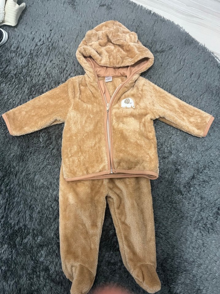 Kahverengi, kapüşonlu ve kürk detaylı yumuşak ve sıcak bebek tulumu. Sokak stiline uygun rahat tasarım. 3-6 ama 9 aya kadar rahatça kullanılır