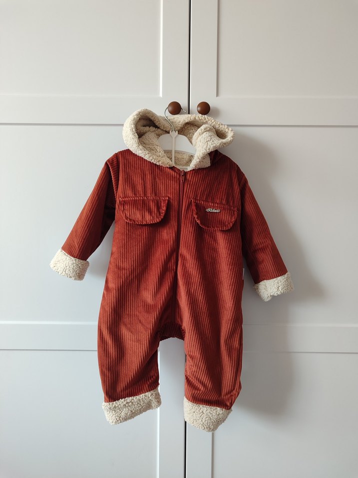 Kahverengi, yumuşak ve sıcak kumaştan yapılmış bebek tulumu. Kapüşon, manşet ve etek kısmında kürk detayları bulunur.