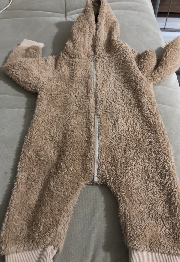 Yumuşak ve sıcak kahverengi bebek tulumu, ön fermuar ve kapüşonlu, kürklü detaylıdır. Bebekleri sıcak tutmak için uygundur.