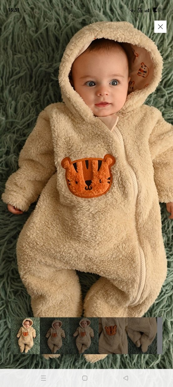 Kahverengi, yumuşak ve sıcak kumaştan yapılmış, kürk detaylı ve sevimli kaplan patch'li bebek tulumu. sıfır ürün