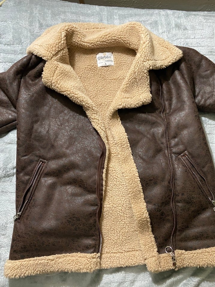 Kahverengi deri ceketin içi yumuşak kürk detaylı, parlak görünümlü, uzun kollu ve kesimi vücuda oturan tarzda tasarlanmıştır. Cepleri yırtık sadece başka hasar yok s-M uyumlu