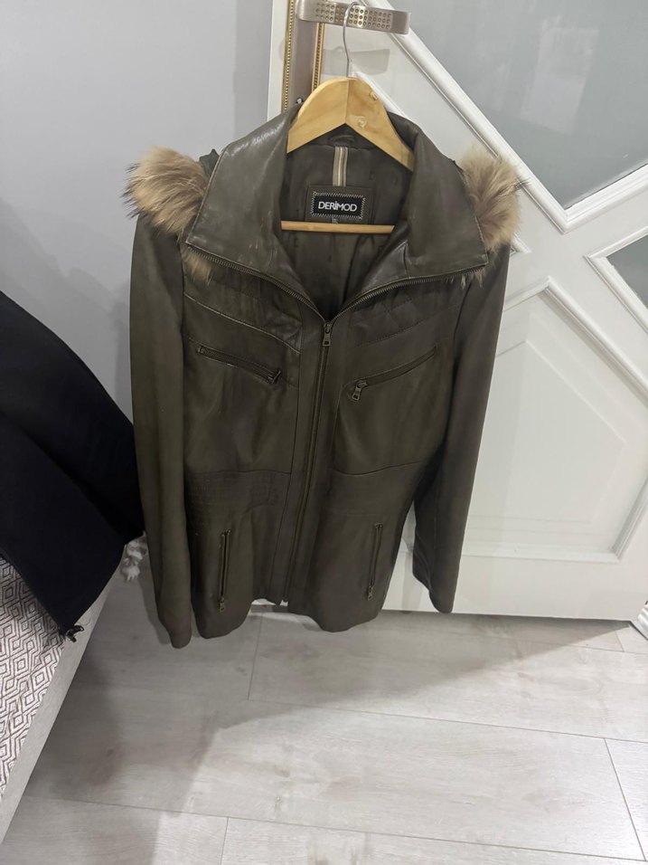 Kürklü kapüşonlu, kahverengi deri, uzun kollu, notched lapel yakalı, dar kesim kadın ceket. Sokak stiline uygun günlük kullanım için ideal.