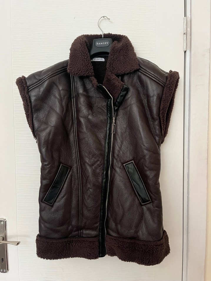 Kahverengi deri ve kürk detaylı, kolsuz, kısa biker ceket. Notlu yaka ve iki cep bulunur, rahat ve şık bir görünüme sahiptir.