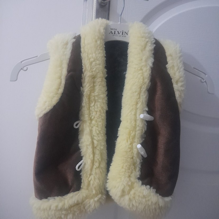 Kahverengi, kürklü detaylı, kolsuz ve dar kesim erkek çocuk yeleği, yakası kesik ve bohem nakışlı stil sunar.
