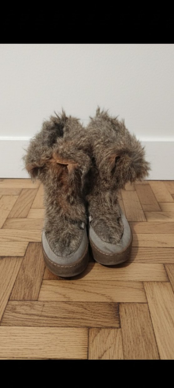 Kahverengi, kürklü ve yün dokulu kadın dolgu topuk botları, rahat ve bohem tarzda, dış mekan kullanımı için uygundur. Bedeni uymuyor yeni gibi.