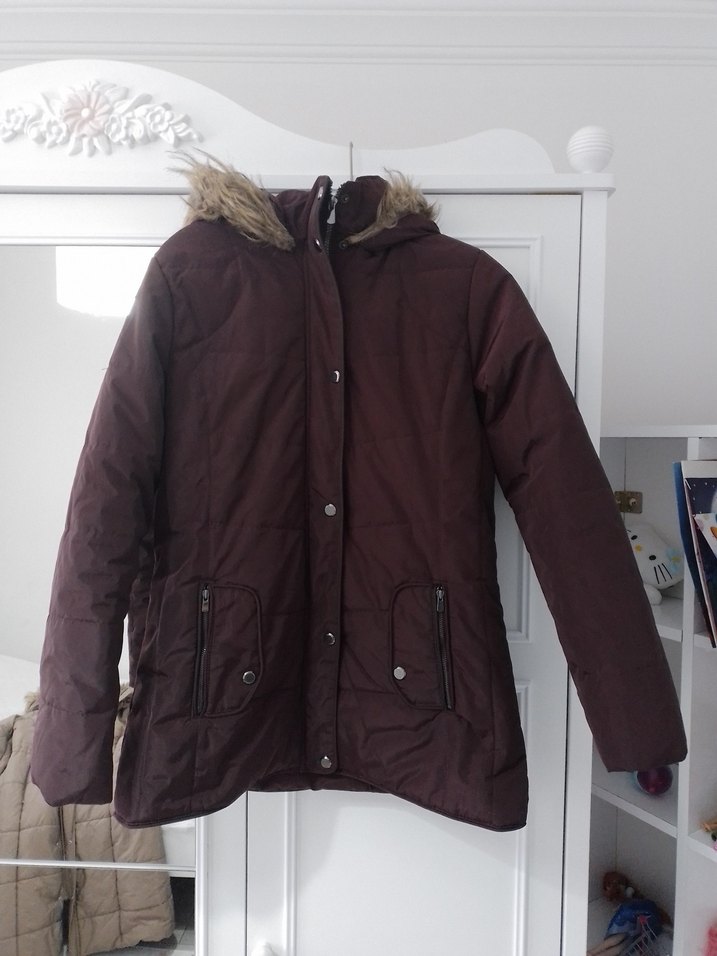 Kahverengi, kürklü kapüşonlu ve yumuşak, sıcak kumaştan yapılmış, uzun kollu, midi uzunlukta, sokak modasına uygun dar kesim kadın kışlık mont.