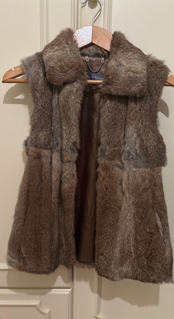 Kürklü detaylı kahverengi , kolsuz, normal uzunlukta, kesimli, günlük kullanıma uygun kadın yeleği.