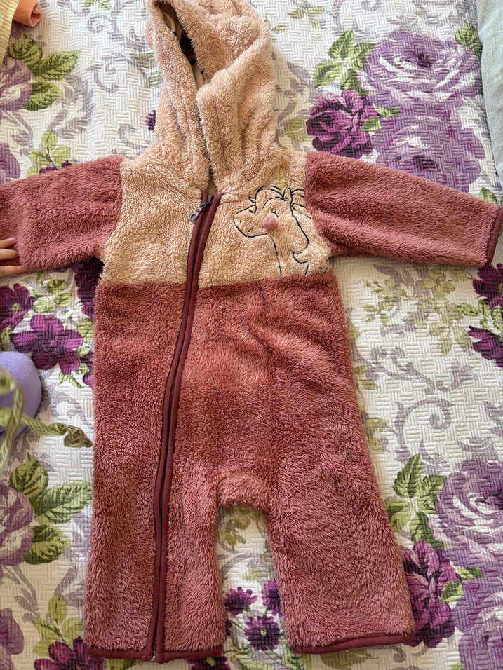 Kapüşonlu ve ön fermuarlı, pastel kahverengi tonlarında kürklü ve nakış işlemeli yumuşak bebek tulumu. Temiz kullanıldı omuzdan 57 cm
