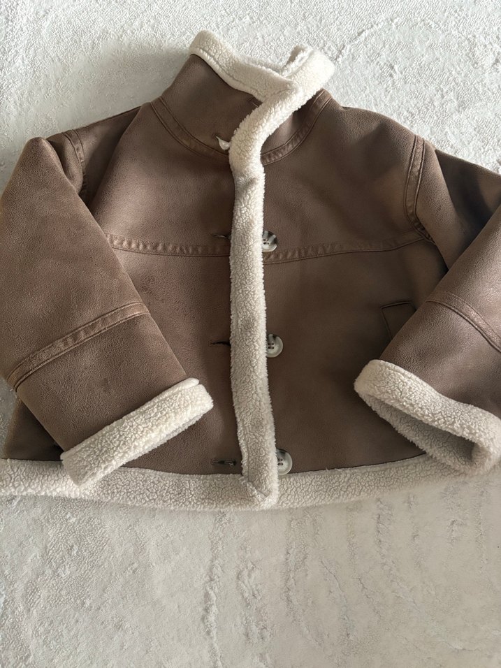 Kahverengi süet kaban, içi tamamen kürklü ve cepli, yepyeni durumda. 7-8-9 yaşa uyumlu.