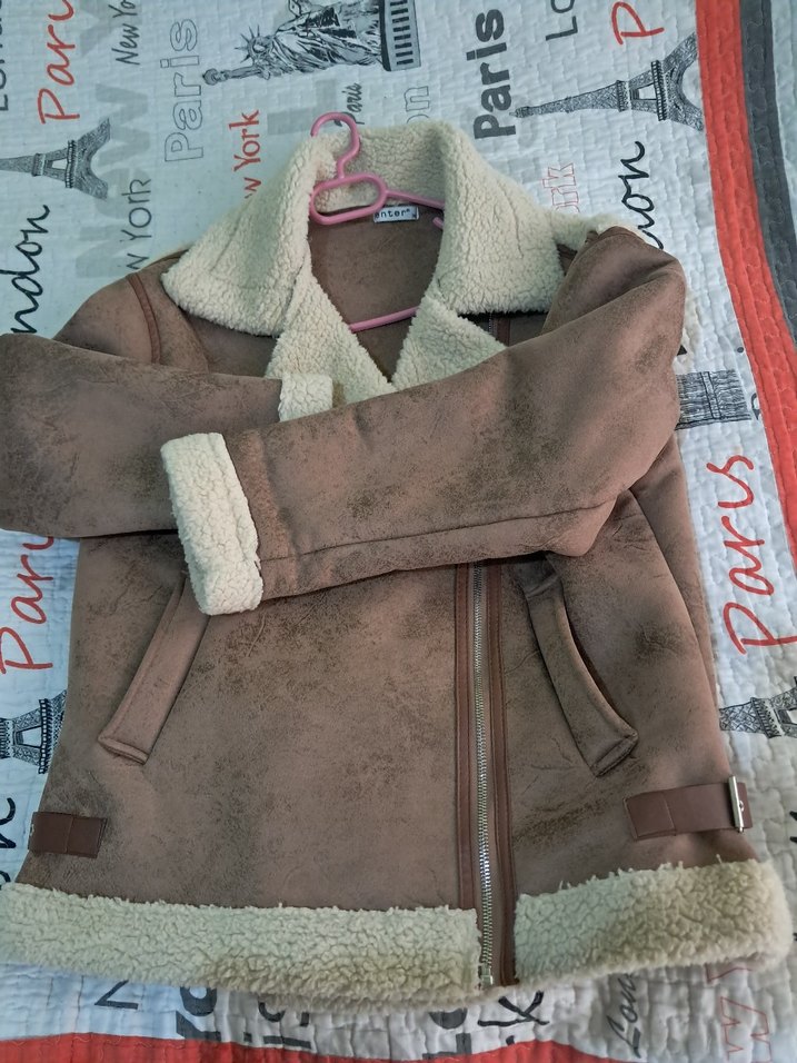 Kahverengi süet kadın ceket, kürk detaylı ve yaka kısmı notched lapel. Uzun kollu, bol kesim ve kısa boyda, rahat sokak tarzı için uygun. sayılı kullanılmıştır ve defosu yoktur.36 ve 38 beden uyumludur.