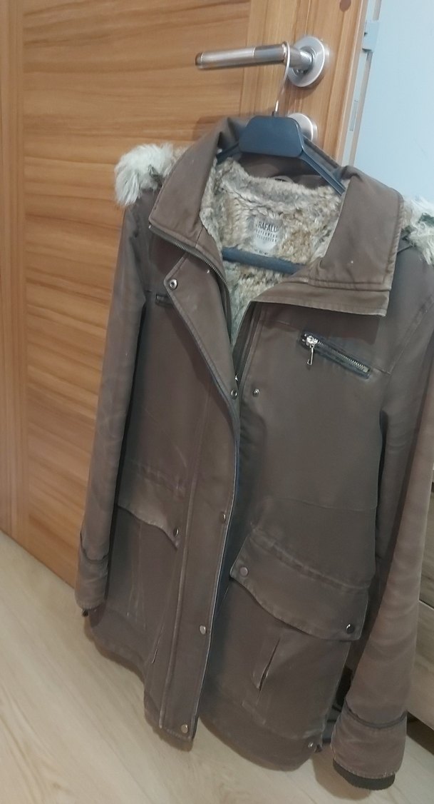 Kahverengi süet kumaştan, içi ve kapüşonu kürklü, uzun kollu, notched lapel yakalı, midi boy, regular fit sokak tarzı kadın ceketi.