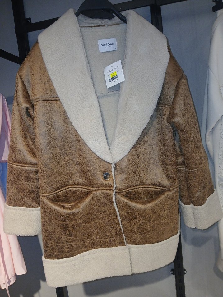 Kahverengi süet kumaştan, kürklü yakalı, manşetli ve etek ucu detaylı, kısa boy, bol kesim kadın ceket. Sokak stiline uygun, günlük kullanım için ideal.