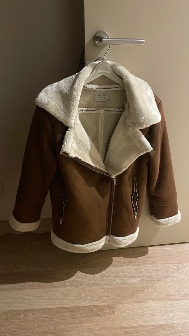 Kahverengi süet ceket, kürk detaylı yakası, manşetleri ve etek ucuyla, kesimi vücuda oturan, uzun kollu ve notched lapel yakalıdır.