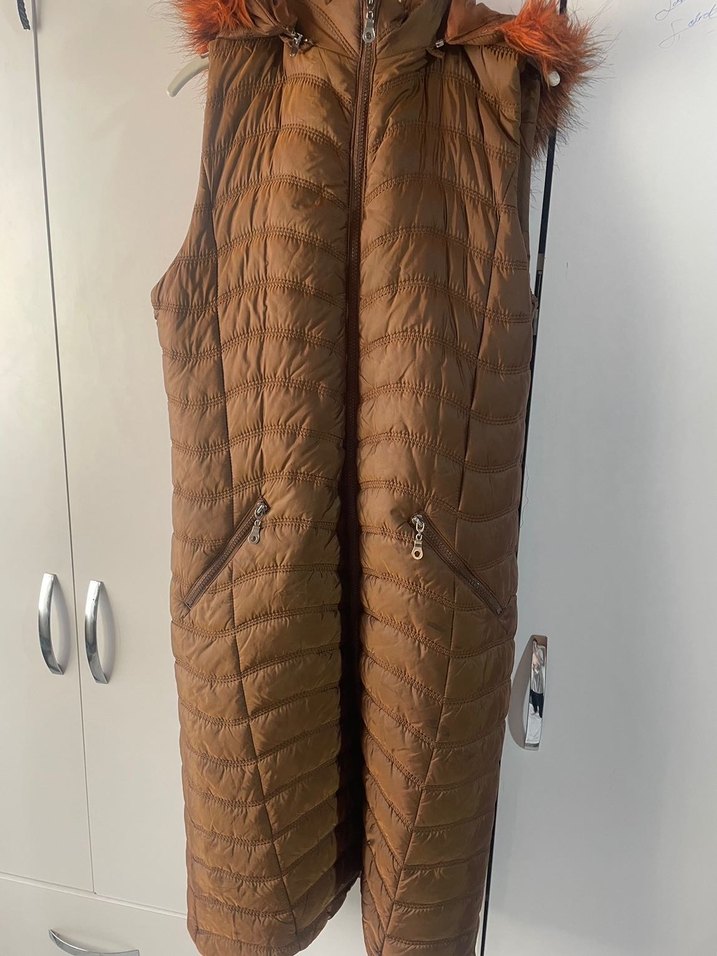 Kürklü detaylı, kahverengi renkli uzun ve kolsuz kadın yeleği. Parlak sentetik kumaştan, yakası kesimli ve fit kesimlidir. Günlük kullanıma uygundur. Görseldeki gibi ufak lekesi var rengini tam anlıyamadım