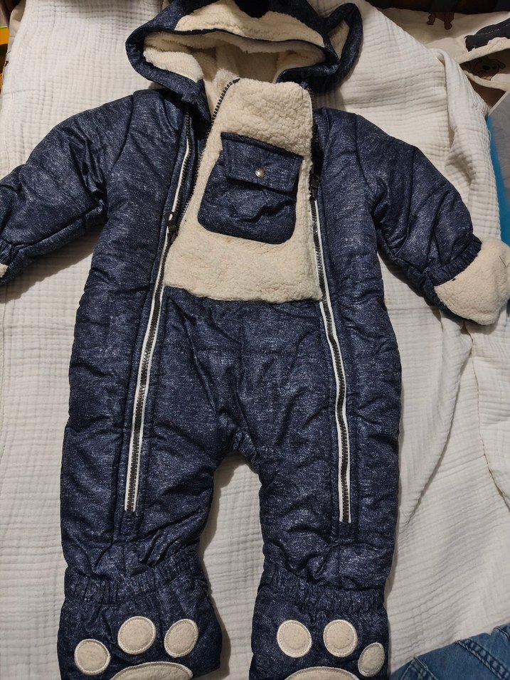 Mavi renkte, kürklü kapüşonlu bebek erkek kayak tulumu. Yumuşak ve sıcak kumaş, çift ön fermuar ve küçük göğüs cebine sahiptir. Ayaklarda pati deseni bulunur.