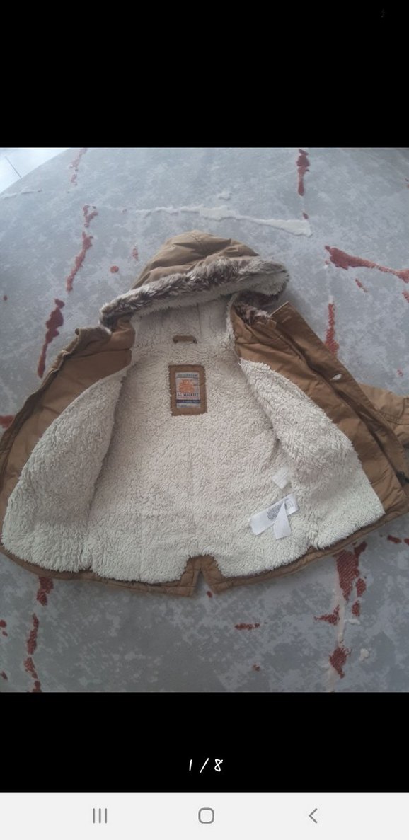 Kahverengi, kapüşonlu ve kürklü detaylı bebek montu, uzun kollu ve yumuşak, sıcak tutan iç yüzeylidir. Sokak stilinde, sade ve düz tasarıma sahiptir.