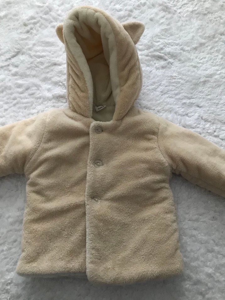 Bej renkte, yumuşak ve sıcak kumaştan yapılmış, kürklü detaylı kapüşonlu bebek montu. Küçük kulaklı kapüşon ve sade normcore stili bulunur. ❄️