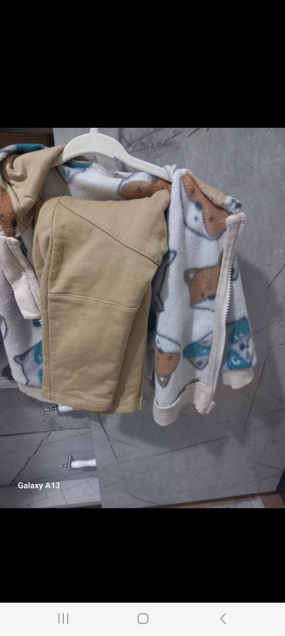 Kürklü detaylı kapüşonlu ve uzun kollu, yumuşak ve sıcak kumaştan yapılmış kahverengi bebek takımı. Sokak stili için uygundur.