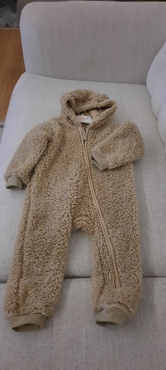 Kahverengi, yumuşak ve kürklü dokulu kumaştan yapılmış kapüşonlu bebek tulumu. Önden fermuarlıdır, sade ve normcore tarzda.