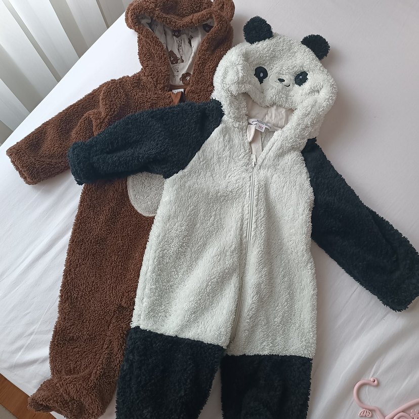 Kahverengi ve gri renklerde, kürklü detaylı ve işlemeli desenli yumuşak bebek tulumları. Kapüşonlarında hayvan kulakları bulunur. ikili fyat