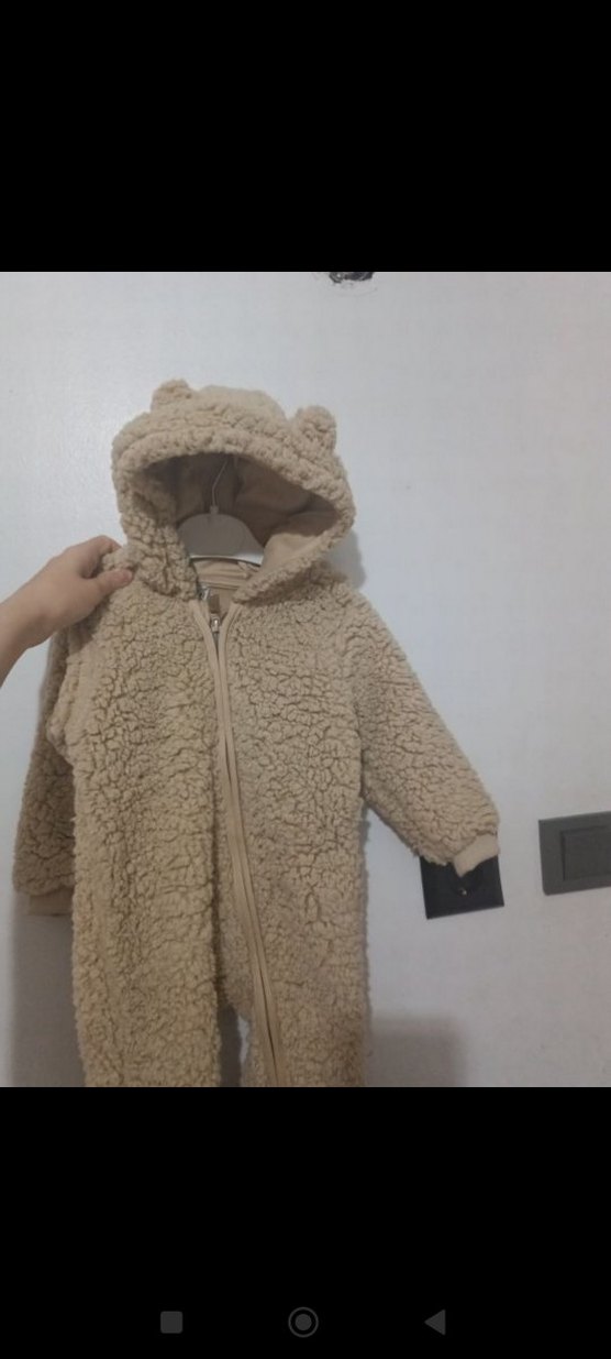 Kahverengi, yumuşak ve sıcak kumaştan yapılmış, kürklü detaylı kapüşonlu bebek tulumu. KIZIMA KÜÇÜK OLDUĞU HİÇ KULLANILMADI.