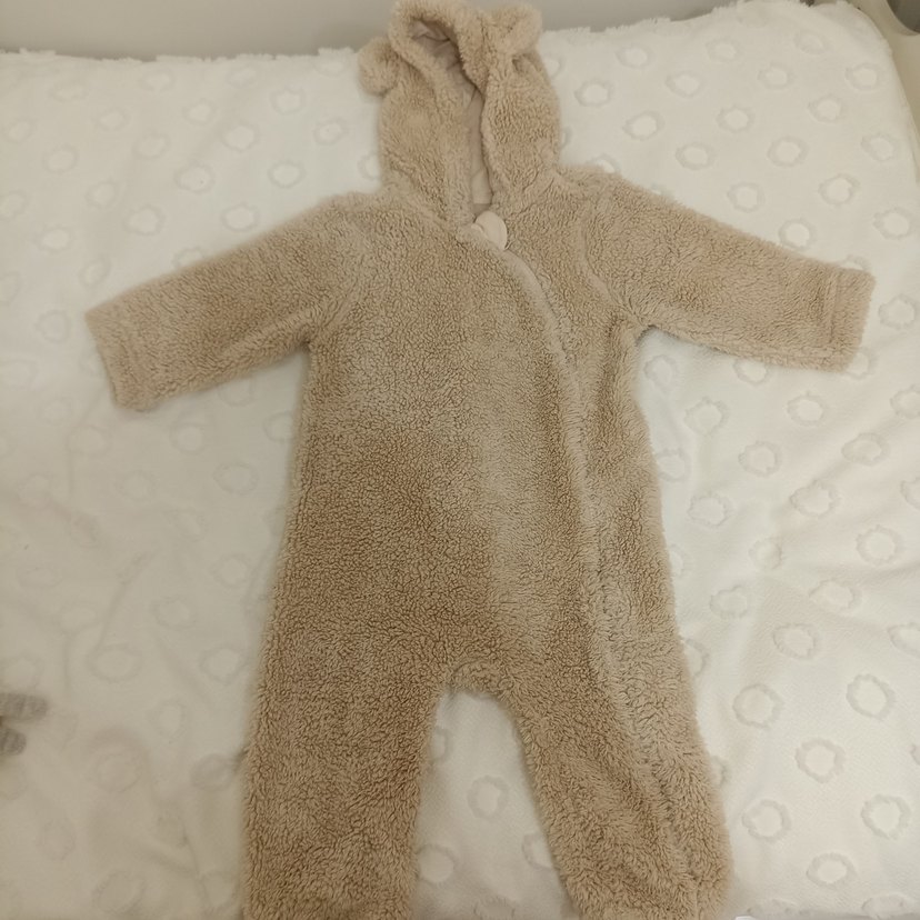 Bej renkte, kürklü kapüşonlu, yumuşak ve sıcak kumaştan bebek tulumu. Az kullanıldı