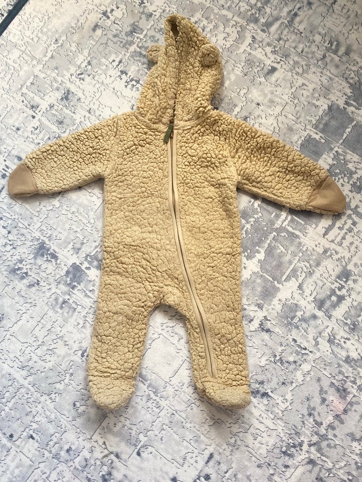 Yumuşak ve sıcak kürklü detaylı kapüşonlu bebek tulumu. Tam ön fermuarlı, rahat ve doğal kahverengi tonunda.