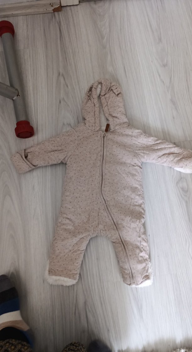 Kapüşonlu ve yumuşak kürk detaylı, açık kahverengi ve hafif gri tonlarında bebek tulumu. Önden fermuarlı ve desensiz tasarıma sahip. ❄️